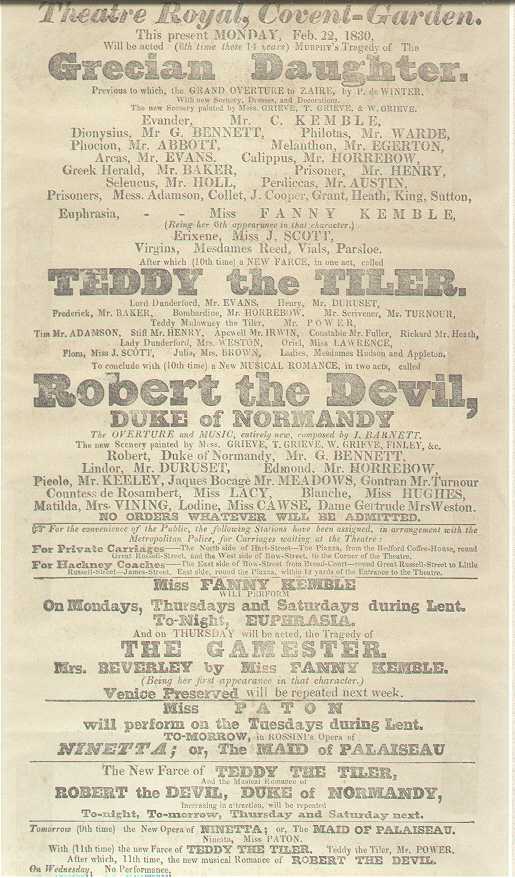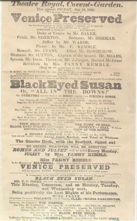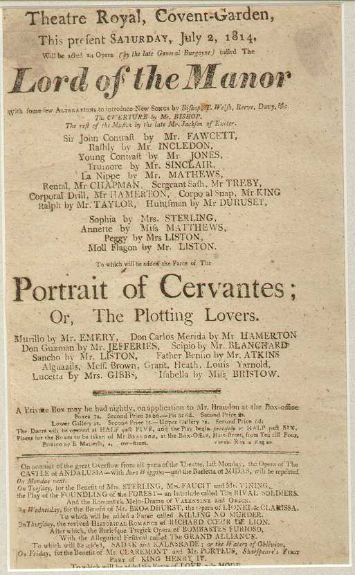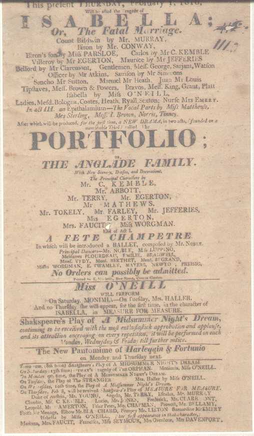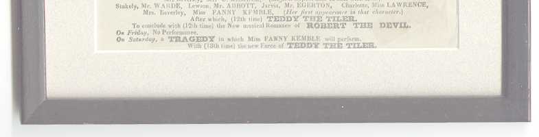 Theatre Royal, Covent-Garden, four 19th Century Georgian broadsides/playbills, three of them chronicling the career of the famed Kemble family. Each professionally framed under glass, with high quality matting and backing. (Note: Some of the sheets exceed the size of the scanner bed, making the images partial. The images also appear somewhat darker than they actually are.) SATURDAY, July 2, 1814. Frame size 10" width X 14" height; page size 6 3/4" width X 10 3/4" height. Lord of the Manor. Reference to William Shakespeare's First Part of King Henry IV. THURSDAY, February 1, 1816. Frame size 11" width X 15 3/8" height; page size 7" width X 11 3/4" height. Isabella; Or, The Fatal Marriage, with Mr. C. [Charles] Kemble. Reference to William Shakespeare's A Midsummer Night's Dream and Measure for Measure. FRIDAY, Dec. 18, 1829. Frame size 10 1/4" width X 16" height; page size 7 1/2" width X 13" height. Venice Preserved, with Charles Kemble and Miss Fanny Kemble. Reference to William Shakespeare's Romeo and Juliet, with Juliet by Miss Fanny Kemble. MONDAY, Feb. 22, 1830. Frame size 10" width X 16" height; page size 7 1/8" width X 13" height. The Grecian Daughter, with Mr. C. Kemble and Miss Fanny Kemble.
