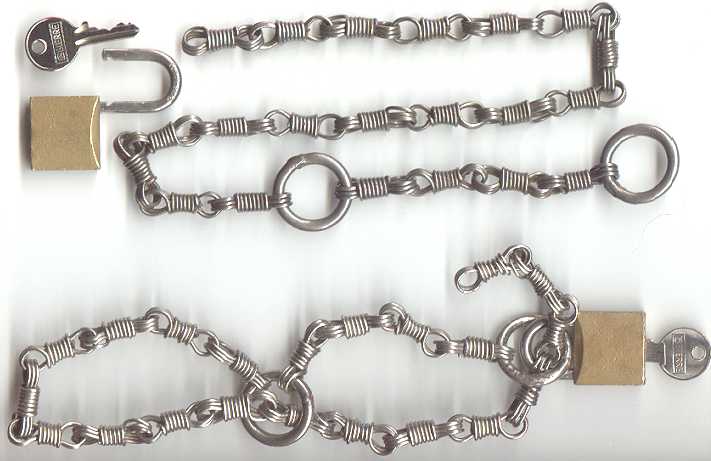 Italian police, or carabinieri, chain handcuffs. Of French-style (or possibly French-made) links and two rings. The end link is passed through the inner ring to form the first cuff, then through the end ring to form the second cuff. The handcuff then is secured with a padlock. The handcuffs of nickel plated steel, the padlock of brass and hardened, or temperato, steel. The simple whilst effective design of the padlocking chain handcuff was used into the third quarter of the 20th Century. The Italians were not slaves to or intimidated by complex technology.