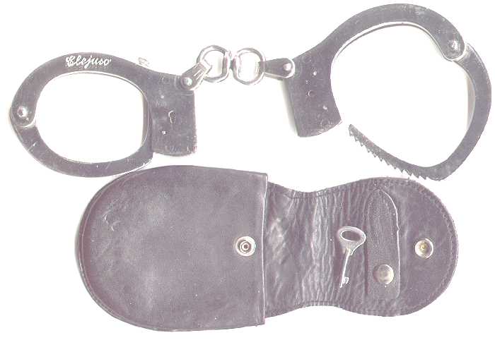 The prestigious, prolific German giant Clejuso -- an acronym for Clemen & Jung, Solingen -- was established in 1860. According to Manacles of the World author Tom Gross, the early model 12D, of which there were several variations, "may very well be the first Clejuso handcuff design. It is similar to the traditional French handcuffs in its elliptical or 'eggplant' shape." Of nickel plated steel, this double locking version is accompanied by its original leather pouch and original key. Very deeply stamp-marked Clejuso, in script, on each cuff. Clejuso states it introduced the model 12D in 1946. Click here for an image of the handcuffs and their pouch. Click here to see another pair, this one with its key marked CLEJUSO.