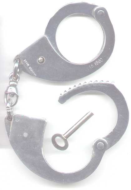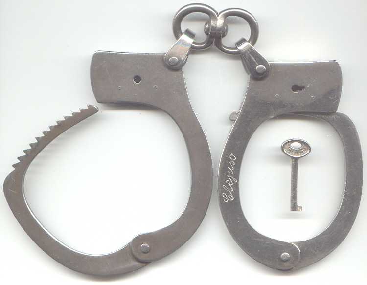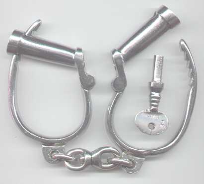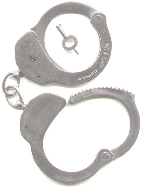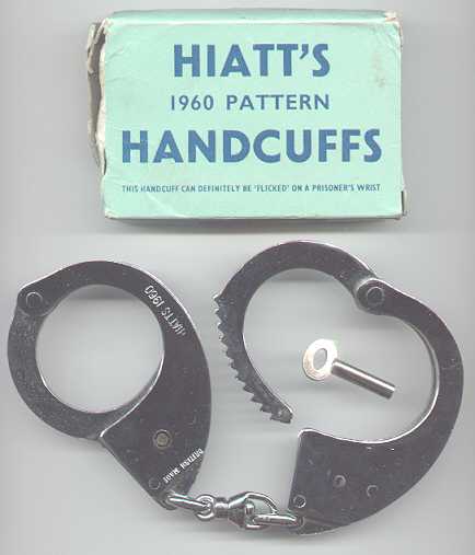Another Hiatt's 1960 Pattern pair of handcuffs, also stamp-marked HIATTS 1960 and BRITISH MADE on one of the cuffs. This was the last Hiatt & Co. -- soon to become Hiatts -- handcuff, and the only post-darby model, to be produced in multiple sizes. Three versions were made during the decade. The immediate successor to the darbies, the 1960 Pattern retained the darby links.
