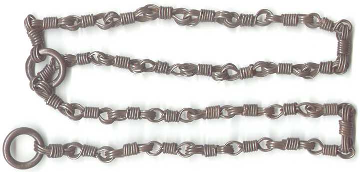 From France, four and forty inches of 19th to early 20th Century prime prisoner transport chain. The end rings and characteristic braided coiled links of nickel plated steel. Age has produced a smooth, deep, rich patina, providing a dark bronze appearance. Excellent condition. French convicts, if nothing else, travelled in style.