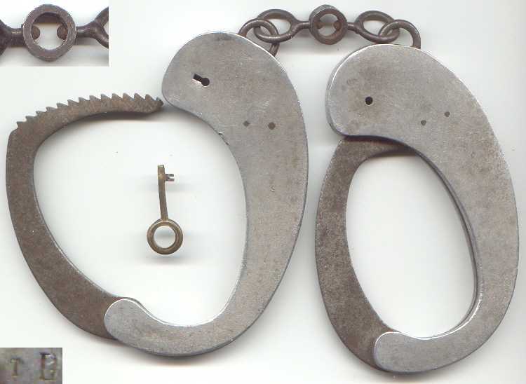 Circa 1940s, single locking, oval-shaped French handcuffs. Stamp-marked on one of the aluminium cuff casings A3749 and TD. The bows, connecting links and key are of steel. There was more than one version of this handcuff model. This version, with the centre connecting link a 1/4" height X 1/2" diameter cylindrical ring, is the rarer one.