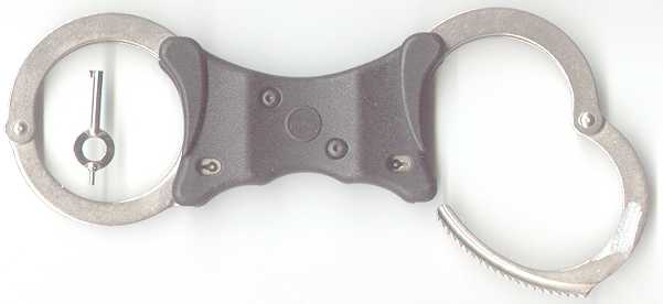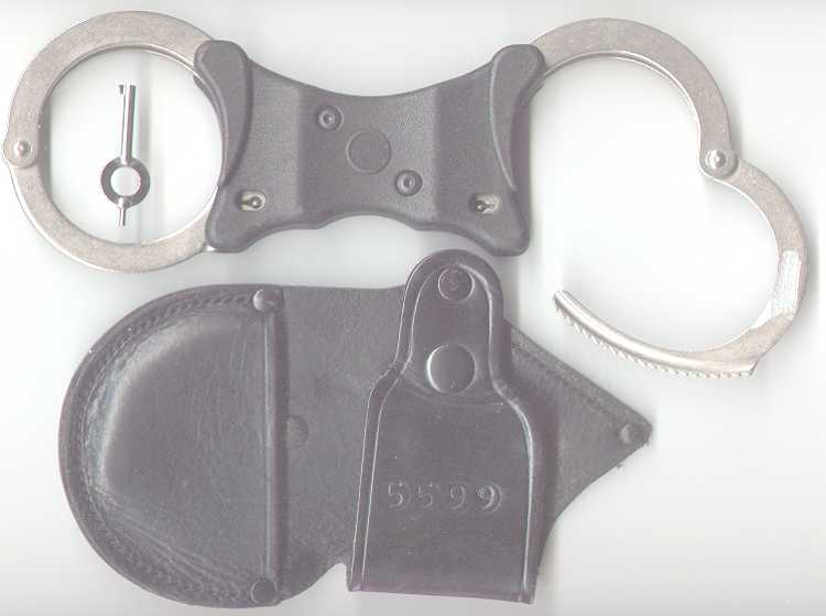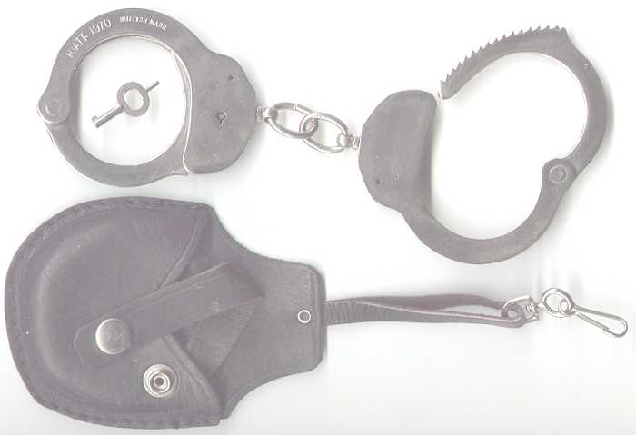 In the 1990s, Hiatts chairman Geoffrey William Cross designed an integral rigid steel handcuff with an ergonomic plastic grip. It was designated the Speedcuff Rapid Control System. Model 2103 is the steel deluxe satin nickel finish. The weight is 14 oz. The handcuffs double lock and incorporate Hiatts' back-loading feature. The circular disc in the grip's centre reads HIATTS UK. DES APPL. No. [Design Application Number] 2034362. This pair of cuffs comes with the Hiatts Model SCP5 black leather pouch with belt loop, this one number 5599. These handcuffs have been highly controversial since their introduction, their rigid design easily abused to inflict deliberate injury. Hiatts is not quite as explicit, stating instead, "Utilising pressure sensitive areas, it can be a significant aid to gaining control." Click here for an image of the handcuffs and their pouch.