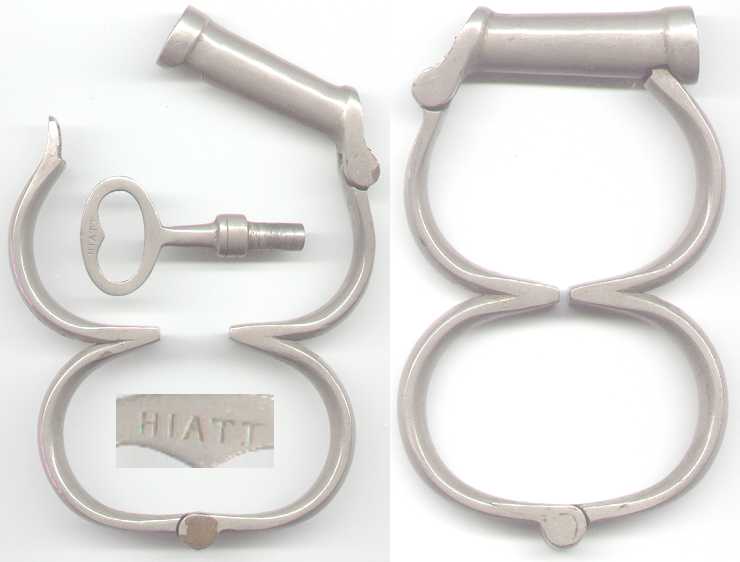 A set of Hiatt (Birmingham, England) Figure Eight, also called Irish Eight, handcuffs, with working drum-cylinder lock and key. Deeply stamped on one side HIATT and on the other side BRITISH MADE. According to Hiatt Chairman G. W. Cross, "They were the first handcuffs issued to the Metropolitan Police of London in about 1832." Vintage, venerable and in excellent condition, many collectors regard this uniquely designed police restraint by this famous English maker of manacles to be the Holy Grail of handcuffs. The figure eight handcuff was Hiatt's number 103.