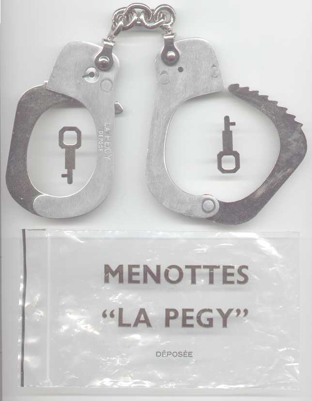 The single locking La Pegy handcuff was made in France during the 1950s. Sometimes thought to be derived from La Pègre, meaning "the gangster underworld", the actual derivation is from the French pronunciation of the initials PJ, for Police Judiciaire, meaning Criminal Investigation Department. The aluminium casing, or housing, has a brushed satin finish, and is stamp-marked LA PEGY over DEPOSE (meaning "trademark") on each cuff. The locks, the bows, or jaws, the two original keys and the five-link chain and attaching clevises are steel. The overall weight is light, only about 7 1/2 ounces. The original manufacturer's plastic bag is marked MENOTTES (meaning "handcuffs") over "LA PEGY" over DÉPOSÉE (again, meaning "trademark"). Unlike nearly all pairs of other handcuffs, the individual La Pegy cuffs are not mirror images of each other but are identical. Click here for an image of the handcuffs and their original manufacturer's plastic bag. The La Pegy is more than an handcuff; it is a fashion statement -- an extraordinarily elegant, stylish fashion statement. This one is in new condition. (An earlier version can be seen in the 1964 James Bond motion picture Goldfinger.)