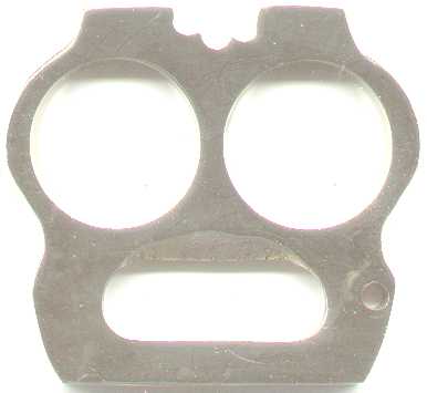 Two-finger knuckle-duster with a sharply scalloped top. 2 3/4" height X 1/4" thick. Smoothly finished surface. A substantial piece.