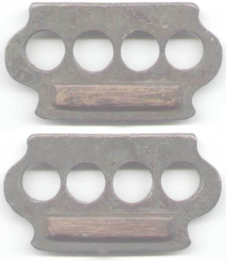 A very old and very unusual set of knuckles with an hardwood insert. The knuckles measure about 4 3/4" width X 2 1/2" height X 1/4" thick. The rectangular wooden insert, set into an hole through the grip and secured by a ferrous screw through the bottom of the base, measures about 2 3/4" width X 1/2" height X 3/4" thick. The set weighs slightly under 8 ounces and, save for the inset wood, has been coated to give it a subdued finish. Whilst obviously not a factory or a production piece, it is made exceptionally well, with all edges rounded. It is a comfortable, by any standards substantial set, a tribute to the craftsman who made it so many years ago.