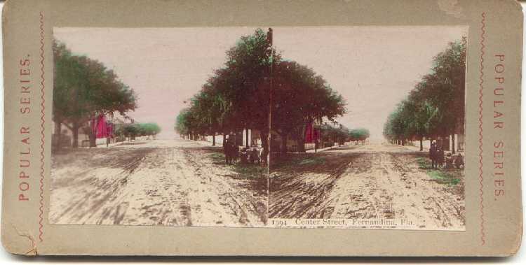 From the last quarter of the 19th Century, a 3 1/2" height X 7" width stereoscopic photographic image -- or stereoview or stereo view -- of Centre Street. Hand-tinted colours. With POPULAR SERIES. on each vertical border, and the caption "1394 [of the series] Center [sic] Street, Fernandina, Fla." at the bottom of the right pane. This card is part of the permanent Stereoview Gallery at Florida Center for Instructional Technology, College of Education, University of South Florida, located in Tampa, FL.