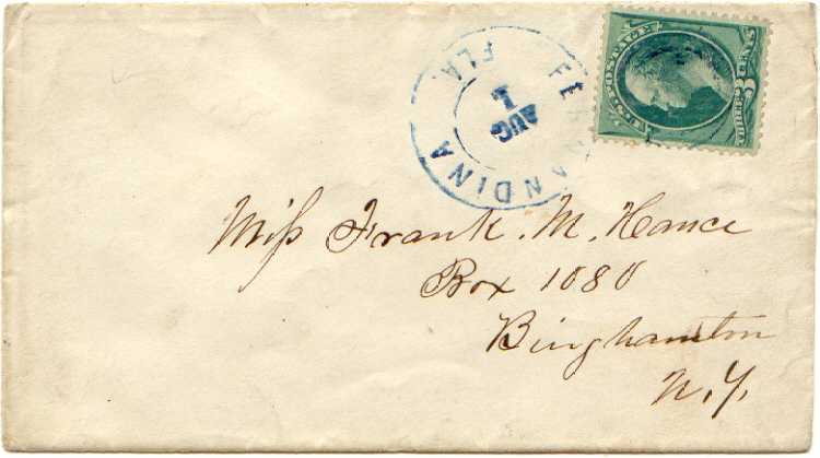 Rare 19th Century Fernandina postal cover. 5 1/8" width X 2 7/8" height, addressed to Mrs Frank. M. Keance / Box 1080 / Binghamton / N.Y. Lovely blue CDS (circular date stamp) reading FERNANDINA FLA. AUG 1. The three cent postage stamp being in use from 3 March 1863 to 2 March 1883, this early envelope dates accurately to between 1 August 1863 and 1 August 1882.