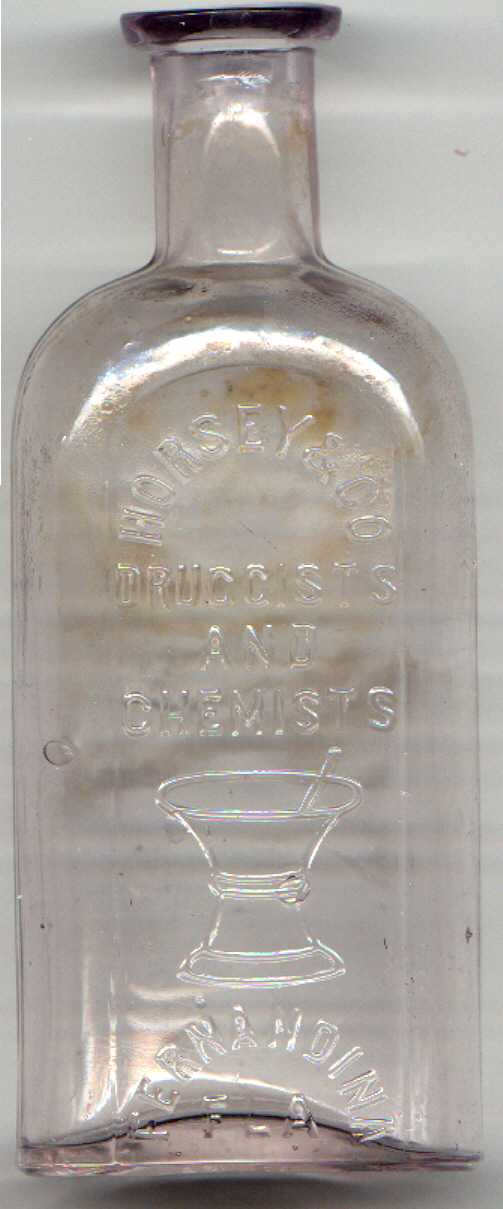 19th Century 5 1/4" Horsey & Co., Fernandina, apothecary, or medicine, bottle. In raised lettering, HORSEY & CO / DRUGGISTS AND CHEMISTS / FERNANDINA FLA, with a raised mortar and pestle design. On the bottom, also raised, W T & CO., the trademark in use from 1875 to 1901 of Whitall-Tatum, the bottle makers, of Milville, New Jersey. The Horseys were a prominent Fernandina family. Their large Queen Anne style house, at the corner of Seventh and Centre Streets, was built in 1902 by Durham, North Carolina architect George Watts.