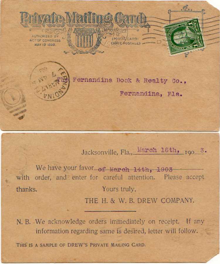 1903 Private Mailing Card from The H. & W. B. Drew Company of Jacksonville -- The Drew Press, the same company that printed the stock certificate below -- to The Fernandina Dock & Realty Co., Fernandina, Fla. The two CDSs (circular date stamps) read JACKSONVILLE, FLA, MAR 16, 630 PM, 1903 and FERNANDINA, FLA., MAR 17, 7AM, 1903. Incorporated in 1901 by banker Fred Willis Hoyt, the Fernandina Dock and Realty Company was the successor to the Fernandina Development Company and the Florida Town Improvement Company, incorporated by Samuel Ashe Swann and Arthur T. Williams, the son of Marcellus Alphonso Williams, in 1889 and 1884, respectively, both of which firms Hoyt purchased for $94,000. In 1905, John Mann built Hoyt House, at the south-east corner of Centre and Eighth Streets, where the Hoyt family -- Fred and Kate and their three sons, Charles, Wadleigh and Willis -- lived until 1927, when Hoyt died. The Queen Anne-style home was inspired by the Rockefeller residence on Jekyll Island. This 5 1/2" width X 3 1/4" height, penny-postage postcard confirms an order Hoyt's company placed, likely for stationery.