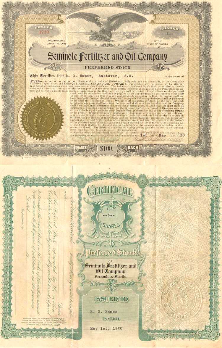 Incorporated in 1918 in Fernandina, Florida, the Seminole Fertilizer and Oil Company was the short-lived predecessor of the still extant Nassau Fertilizer & Oil Company. This certificate for five shares of preferred stock, with a par value of $100.00 per share, was issued on 1 May 1920 to R. C. Hamer of Eastover, South Carolina. The certificate measures 10 7/8" width X 8 1/4" height and was printed by The Drew Press, Jacksonville. It is Seminole Fertilizer and Oil Company certificate number 3719. Robert Hamer died a few years later, but not before purchasing half of what was to become known and renowned as the Kensington Mansion. His family purchased the remaining half of the plantation lands in 1925. Eventually acquired by Union Camp Corporation, subsequently International Paper, Kensington Mansion is maintained by the Scarborough-Hamer Foundation.