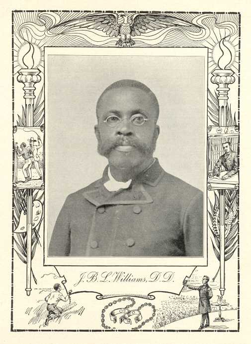 Circa 1902 photographic portrait print, with multi-illustrated border, of the Reverend John B. L. Williams, pastor of the recently built Trinity Methodist Episcopal Church, now the Trinity United Methodist Church, at the corner of Ash and Eighth Streets. The overall size of the print is 9 1/4" height X 7" width; of the image, 7 1/8" height X 5" width. Rev Williams was amongst the most distinguished Afro-American clergymen of his day. A biographical monograph is on the reverse of the print.
