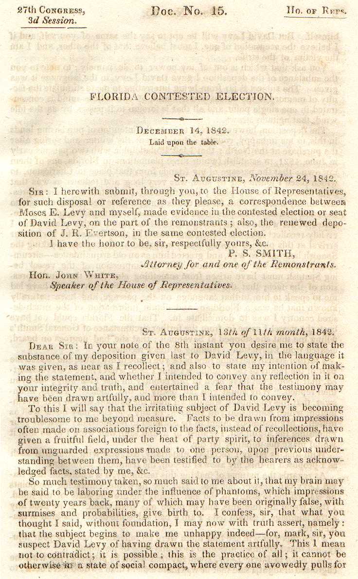 Before Florida was admitted to statehood in 1845 and before adopting his maternal grandfather's surname of Yulee in 1846, David Levy served as a Florida Territorial delegate to the Twenty-seventh and Twenty-eighth Congresses (US House of Representatives), from 4 March 1841 to 3 March 1845. Following the first election, his seat was contested for alienage; i.e., being a foreigner, not a citizen. The contest was resolved favourable to Levy. This became the subject of 27th Congress, 3d Session: House of Representatives: Document Number 15: Florida Contested Election [of David Levy], 14 December 1842. The document is 8 7/8" height X 5 3/4" width and 13 pages long, and contains lengthy statements from David Levy Yulee's father, Moses E. Levy. In 1842, Yulee lived in St Augustine, the original capital of East Florida.