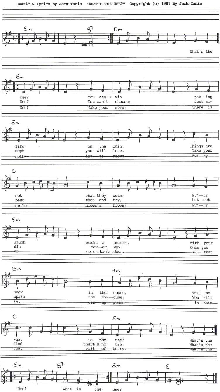 It is said (by us), "Music without lyrics is music whilst lyrics without music are bad poetry." We are unable to post manuscript staff notation, which is limiting. Yet, with the exceptions of our love for our cats and human stupidity and folly, everything has limits. We have done what we are able, inserting musical chord symbols into our sample song lyrics. This marks harmonic changes. The chord symbols appear within brackets -- "[chord_symbol]".
