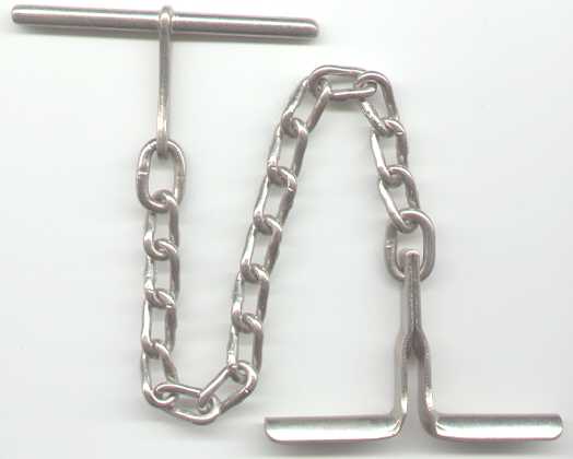 This mint condition twister has interesting features. The chain has large, oval end links. The retaining handle is folded at the bottom, comprising symmetrical, opposing halves. The horizontal section of the T-handle is perfectly cylindrical, not oval or flattened at all. It passes through a hole at the top of the concave vertical section, which has a corresponding hole at its bottom, receiving the chain. Plated steel construction.